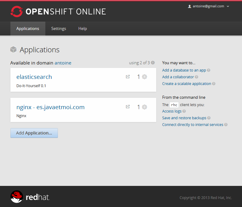 A la recherche d’un hébergeur me permettant d’installer mon index en ligne, je suis tombé sur le billet Searching with ElasticSearch on OpenShift de Marek Jelen, évangéliste OpenShift. C’était l’occasion de découvrir l’offre Cloud de RedHat, et cela sans sortir ma carte bancaire. En effet, OpenShift offre 3 Gems limitées à 512 Mo de RAM et de 1 Go d’espace disque. Avec un index de 160 Mo, c’était amplement suffisant.