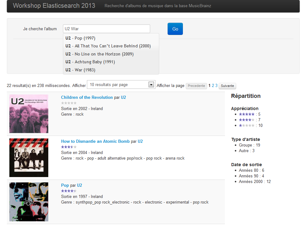 La recherche fulltext utilise quant à elle le type de recherche fuzzy_like_this permettant une recherche approximative sur le nom de l’album, le nom de l’artiste et la date de sortie de l’album. Trois facettes de types différents permettent d’afficher la répartition du nombre de résultats en fonction du type d’artiste (terms facet), des appréciations (histogram facet) et de la décennie (range facet). Le gist 7436893 présente la commande curl équivalente :