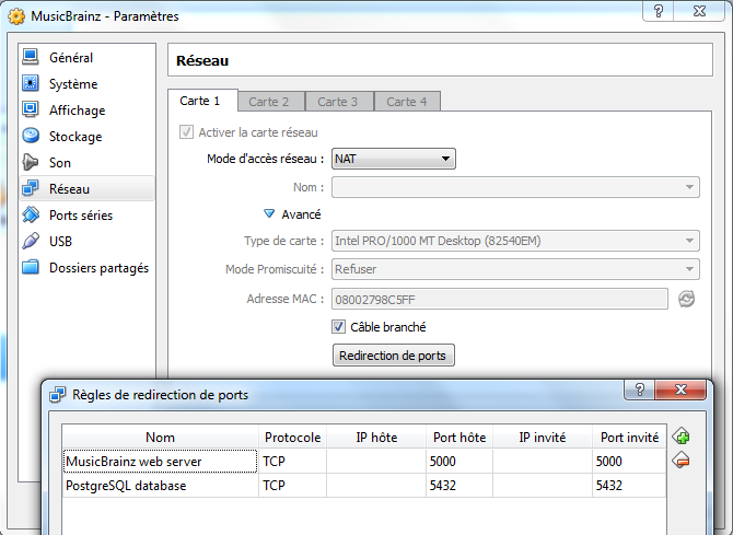 Configurer la redirection de port : VirtualBox permet de rediriger les connexions TCP établies sur un port de l’host vers un autre port de la VM. La base PostgreSQL écoutant sur le port 5432, la règle suivante peut être ajoutée via l’interface de VirtualBox : PostgreSQL database - TCP - host : 5432 / guest : 5432