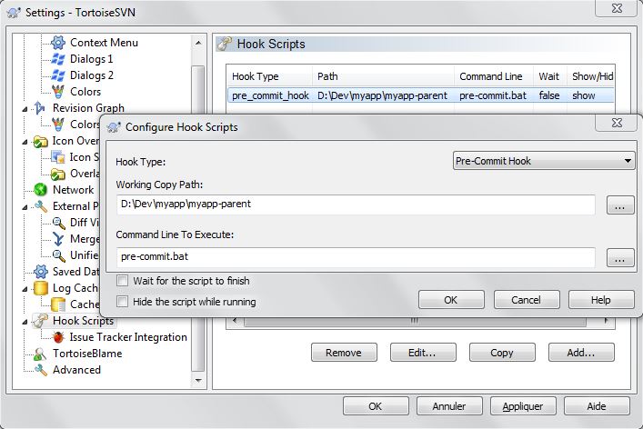 - De manière globale pour tous les repos SVN du poste de dév. Chaque développeur doit individuellement configurer TortoiseSVN. Cette configuration peut être problématique lorsqu’un développeur est amené à travailler sur plusieurs repos et que le script de hook n’est pas assez générique. Le script précédent devra être généralisé pour fonctionner avec l’ensemble des projets.