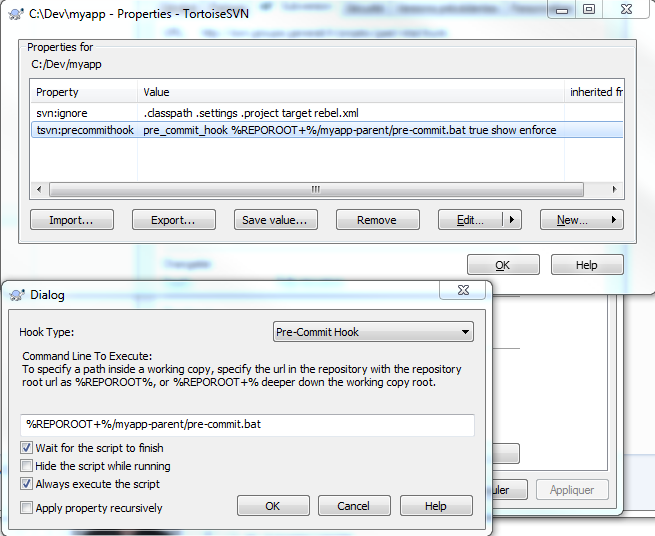 svn:ignore, TortoiseSVN ajoute récursivement une propriété tsn:precommithook au niveau du repository SVN. Tous les développeurs bénéficient alors de ce hook.