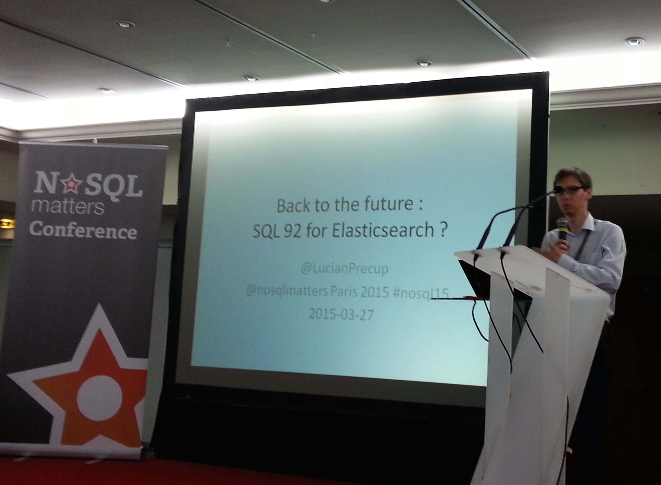 Burno Guedes, CTO de Zenika, a quant à lui réalisé une démo similaire avec HAWQ. HAdoop With Query est une implémentation de PostgreSQL qui stocke nativement les données dans HDFS. HAWQ n’est donc pas une technologie de map/reduce. Il peut être vu une alternative à Hive supportant la norme ANSI SQL-92. Associé à Hortonworks , Pivotal est en train de rendre HAWQ Open Source au sein du consortium Open Data Plaform (ODP). Au cours de sa présentation « Back to the future : SQL 92 for Elasticsearch ? », Lucian Precup, CTO d’ Adelean, nous explique que de nombreux utilisateurs d’Elasticsearch se demandent comment réécrire telle ou telle requête SQL avec Elasticsearch. Le cas classique est un développeur qui cherche à migrer ses services métiers de recherche implémentés jusqu’alors en SQL ou en HQL / Hibernate Criteria.