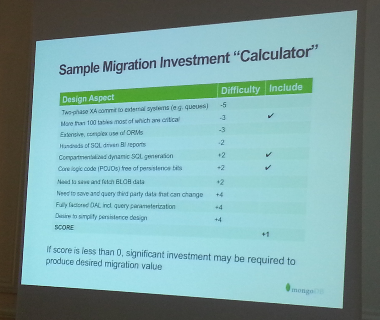 La session « From SQL to NoSQL in less than 40mn» animée par Tugdual Grall, évangéliste MongoDB, a particulièrement retenu mon attention. En effet, elle abordait les raisons qui poussent à migrer vers une base NoSQL : haute performance, disponibilité de 99,999% (<10 mn / an) mais surtout, l’effort et les difficultés qu’il fallait consentir pour passer d’une base de données relationnelles à une base NoSQL. Migrer d’une base Oracle vers Mongo n’a rien à voir avec une migration Oracle vers MySQL. Une telle migration impact en effet toutes les couches d’une architecture :