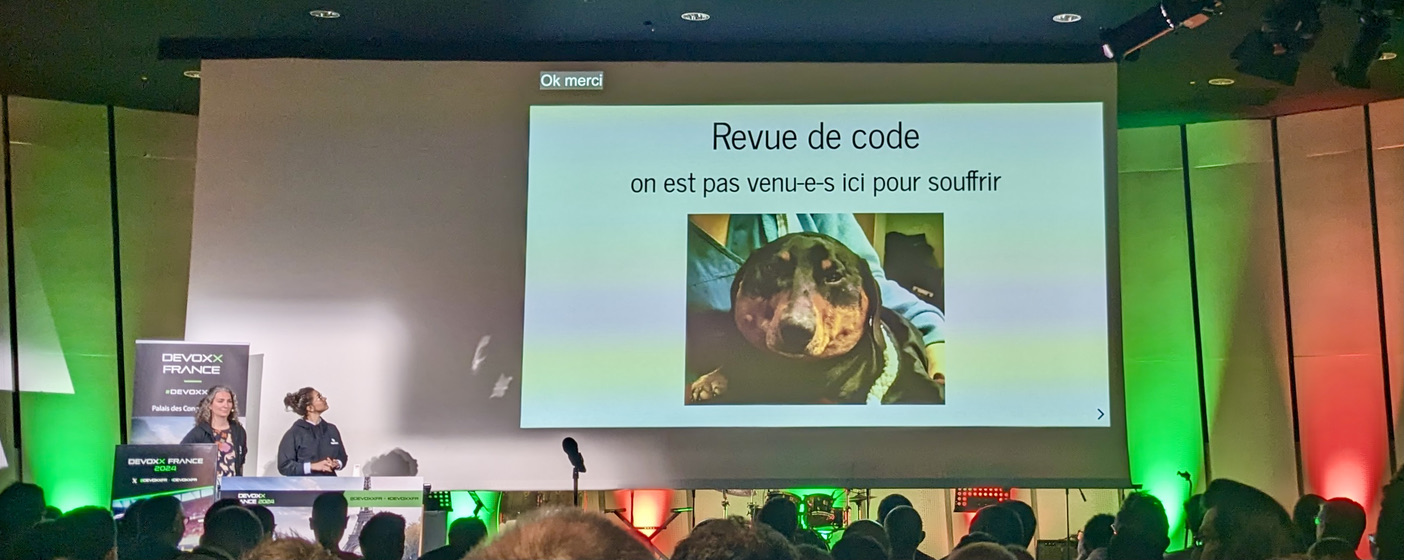 Afin de démontrer à l’assistance qu’un commentaire laissé dans une revue de code peut amener de la confusion, nos deux speakerines commencent leur show en nous montrant une Pull Request sur le repo git de leurs slides reveal : une simple émoticône. Mal interprétée, elle entraine un biais de communication.